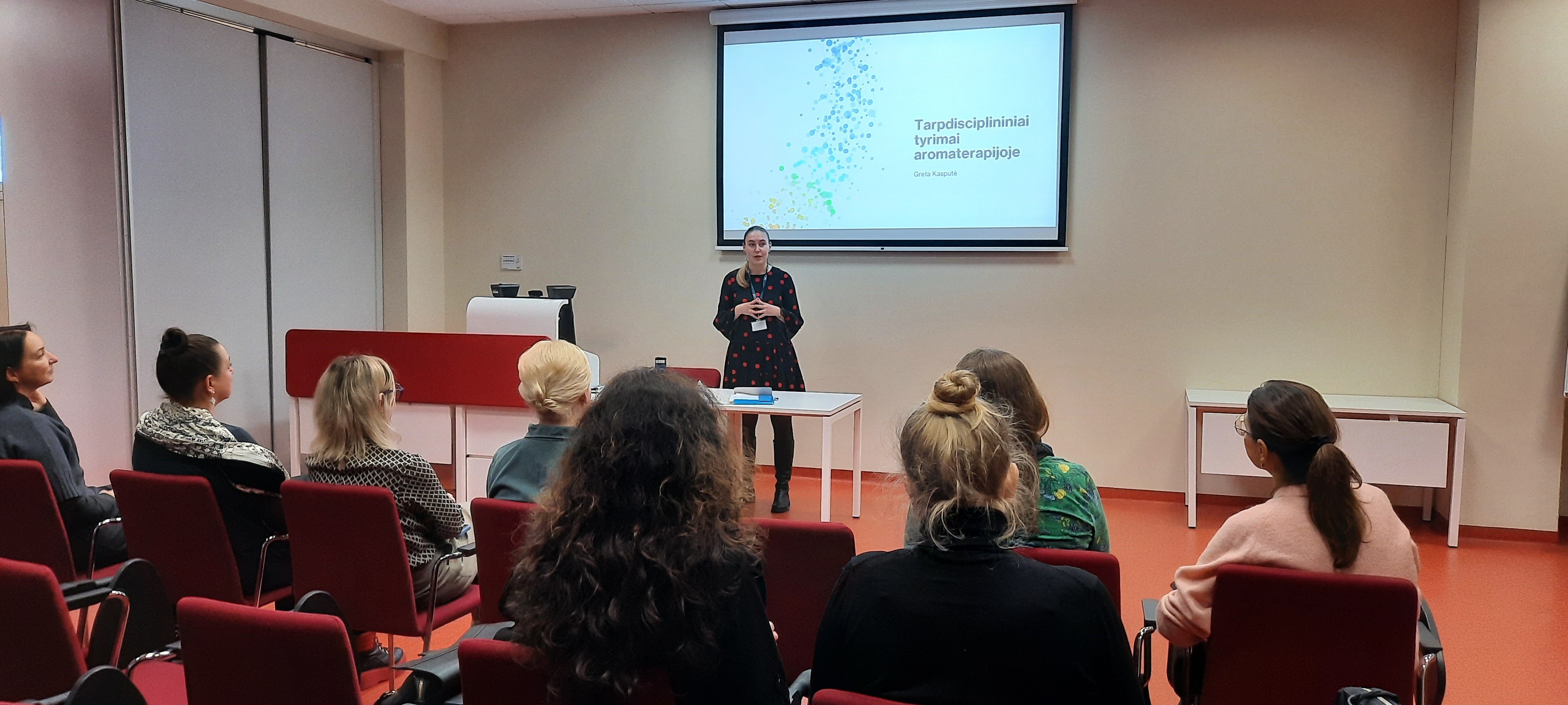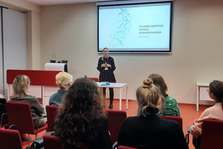IMC viešnios turėjo galimybę susipažinti su Personalizuotos medicinos skyriaus jaunesniosios mokslo darbuotojos Gretos Kasputės tarpdisciplininiais tyrimais aromaterapijos srityje. Greta pristatė savo mokslinį kelią – nuo eterinių aliejų cheminės analizės pirmaisiais studijų metais, paprastosios kraujažolės eterinių aliejų poveikio kamieninėms ląstelėms tyrimų iki elektrocheminių jutiklių eterinių aliejų komponentams aptikti kūrimo.